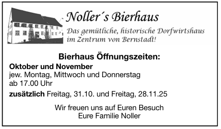 Bereits im Jahr 1432, das wurde urkundlich belegt, verkauften Hans und Heinrich von Bernstadt das Gasthaus zum Hirsch (die örtlichen Weintafeln) an die Stadt Ulm. Im 17. Jahrhundert wurde im Hirsch Bier gebraut, so daß dadurch der Name Bierhaus entstanden ist und bis heute erhalten blieb. In der 2. Hälfte des 17. Jahrhunderts brannte das Gebäude ab. Seit 1688 steht dieser mächtige, ortsbildprägende Bau in seiner heutigen Form und überdauerte als Poststelle, Gasthaus und Brauerei eben das „Bierhaus“ die Jahrhunderte. 2009 wurde das Gebäude von uns (Familie Noller) erworben und ist seither in unserem Besitz. 2012 wurde mit der aufwändigen Renovierung im EG begonnen. Mit sehr viel Liebe und Leidenschaft in Abstimmung mit dem Denkmalamt wurde das Bierhaus vor dem Verfall gerettet.